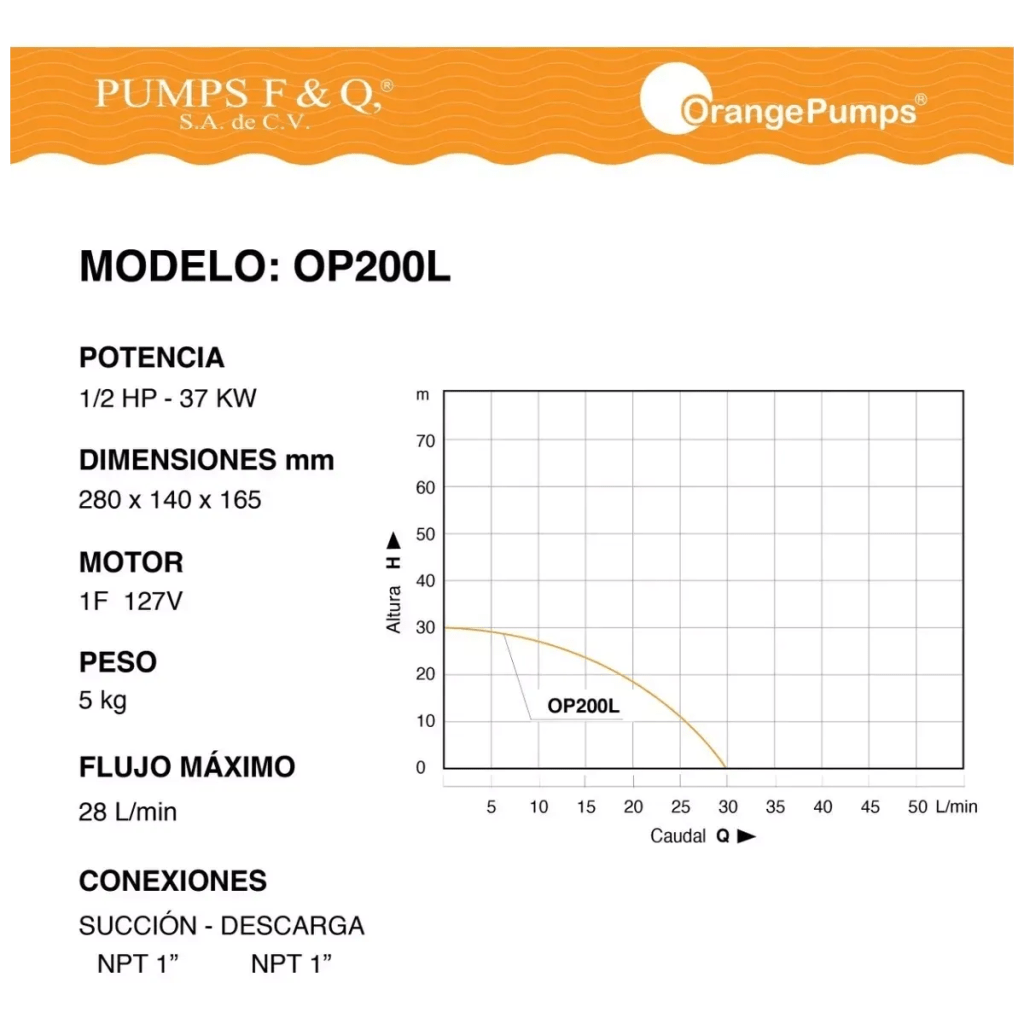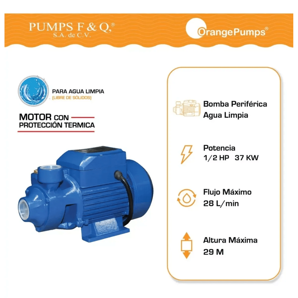 Bomba Periférica De 1/2 Hp Marca Orange Pumps A 127 V Succión Y Descarga De 1X1 Altura Máxima 30M