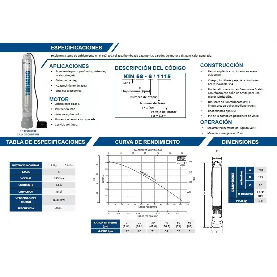 Bomba Sumergible Tipo Bala Con Flotador De 1.1 Hp A 115V Con Descarga De 1.25″